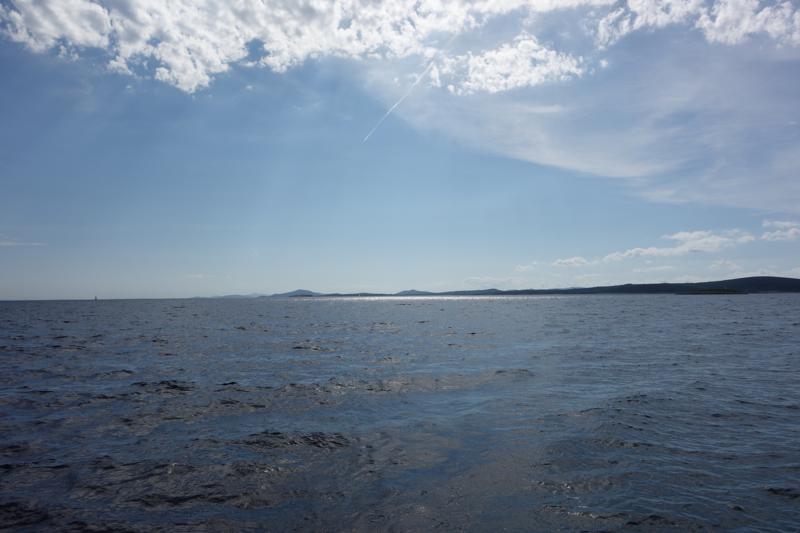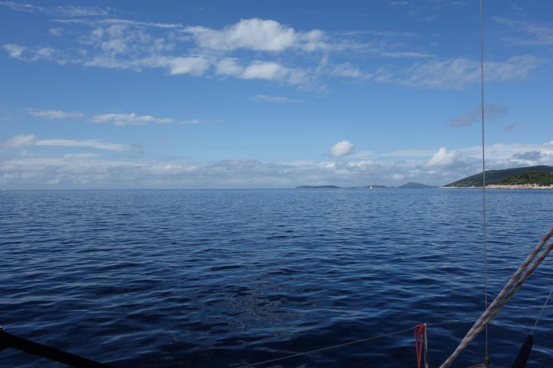 Nach dem Aufstehen um 08:00 und dem Frühstück weisen wir André in das Boot ein, bevor wir um 10:30 die Festmacher loswerfen und bei schwachem Wind unter Segel nach Nordwesten fahren. Um 14:00 Uhr ist unser anvisiertes Ziel noch recht weit entfernt, so dass wir den Motor starten und nun zügig einen Ankerplatz vor Molat anlaufen. Das Ankermanöver klappt problemlos, nach dem obligatorischen Ankerbier nehmen wir erst einmal ein Bad in der Bucht, bevor das Abendessen (Cevapcici mit Ajvar und Reis) gekocht und serviert wird. Die Wassertemperatur ist mit 25 °C sehr angenehm.