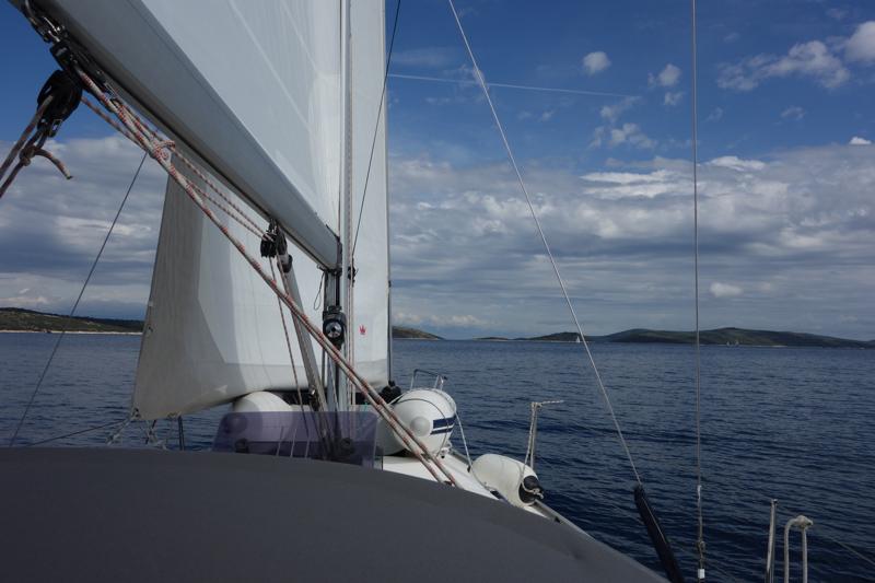 Um 08:00 Uhr standen wir auf. Es regnet leicht und für den Tagesverlauf sind weitere Gewitter angekündigt, so dass wir beschließen, einen weiteren Tag in der geschützten Bucht zu verbringen. Gegen Mittag ändert sich dann aber die Vorhersage, von Gewittern und Starkwind ist keine Rede mehr und auch der Himmel klart auf, so dass wir beschließen, den Anker zu lichten. Bei nun herrlichem Segelwetter segeln wir bis 17:30 in die Bucht von Sestrunj, dort gehen wir vor Anker. Beim Ankermanöver brauchten wir diesmal zwei Versuche, beim ersten Durchgang hat der Anker nicht gehalten, etwas weiter weg in einer kleineren Bucht packt der Anker, wir liegen allerdings recht dicht unter Land. Viel Spielraum bleibt da nicht, wenn der Anker mal slippt...