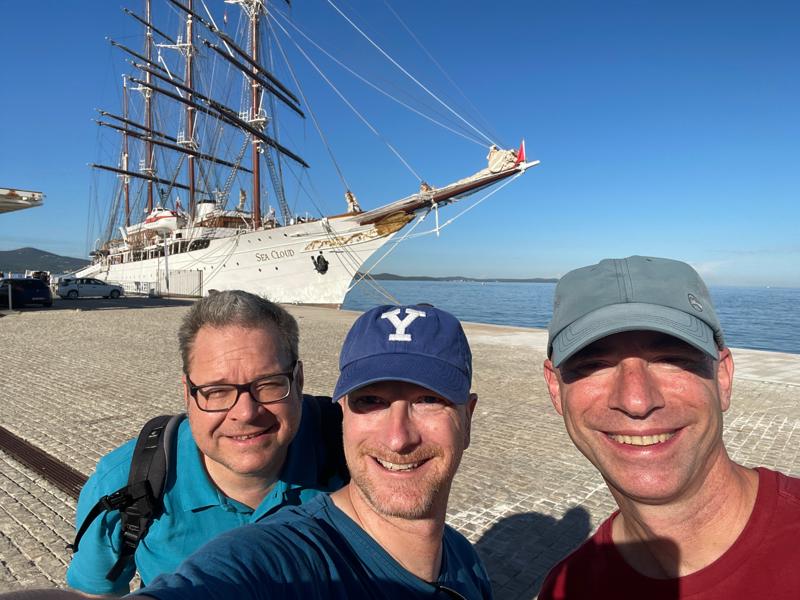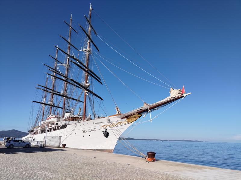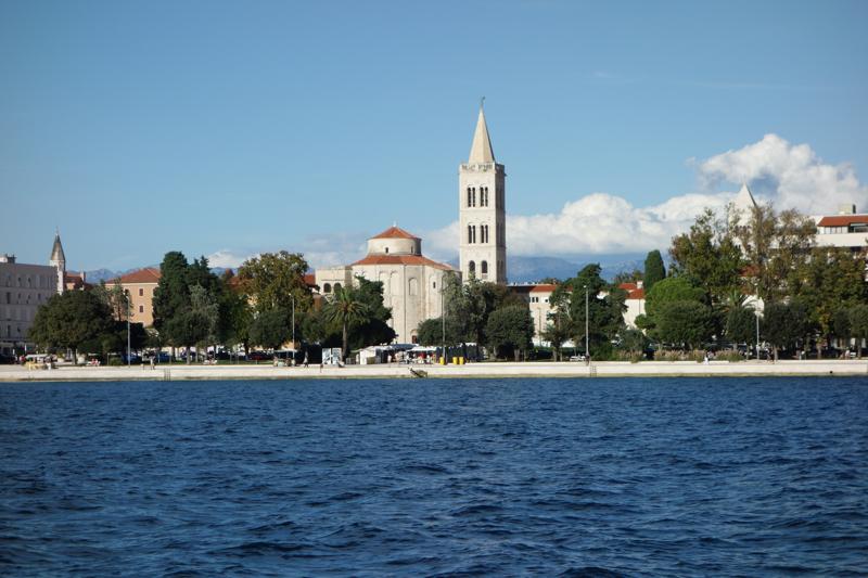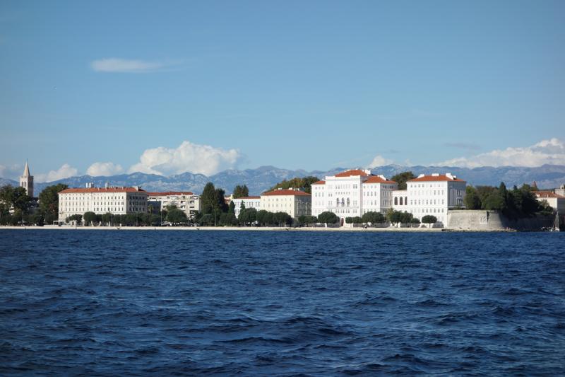 Nach dem Aufstehen um 08:15 Uhr gab es Frühstück, bevor wie üblich um 10:00 die Leinen losgeworfen wurden. Unter Motor fuhren wir unter der Brücke zwischen den Inseln Ugljan und Pasman hindurch (es sah knapp aus, passte aber problemlos von der Höhe). Nach der Engstelle setzten wir die Segel und fuhren nach Norden zur sehr empfehlenswerten Bootstankstelle in Brodanov, südlich von Zadar. Das Anlegen längsseits klappte problemlos, ich war überrascht, dass nur knapp 18 Liter Diesel in den Tank passten, obwohl wir den Motor jeden Tag mindestens 2 Stunden laufen lassten mussten, um die Bordbatterie für Elektronik und vor allem den Kühlschrank aufzuladen. Das Ablegen unter Eindampfen in die Vorspring klappte auch. Da es nun Mittag war, überquerten wir wieder den Kanal nach Ugljan, um dort in einer Badebucht vor anker zu gehen, bevor wir am Nachmittag die letzte Etappe unseres Törns zurück zur Marina Zadar antreteten. Um 17:00 Uhr machten wir dann ohne Probleme in der Marina fest, kurz darauf konnten wir über der Stadt eine Flugshow mit 6 Maschinen beobacten, die teilweise mit Nebelfahne tolle Manöver absolvierten. Nun wurde das Unterschiff per Taucher auf Schäden kontrolliert, anschließend entsorgten wir den Müll und begaben uns zur Fuß in die Altstadt. Hier genossen wir im Restaurant am Brunnenplatz geschmortes Rindfleisch nach dalmatinischer Art mit Gnocci, nach einem Eis ließen wir den Abend in der Garden Lounge bei Shots und Bier ausklingen. Um 00:00 Uhr kehrten wir zum Schiff zurück.